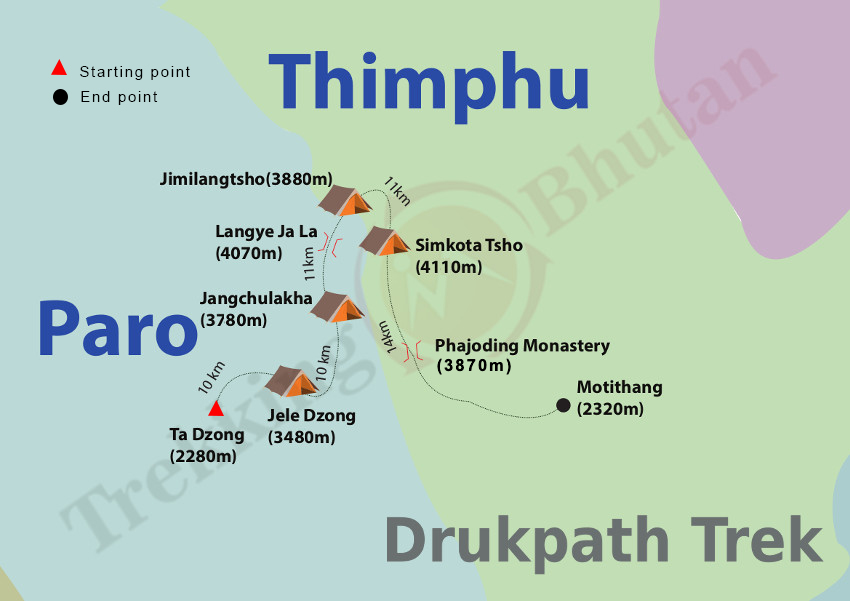 Druk Path Trek is one of the finest short treks in Bhutan. Leading through an ancient trading route, over high mountain passes, it connects the valleys of Paro and Thimphu. The trek begins by walking up through apple orchards and pine forest past ruined Jele Dzong (fortress), which sits on a high grassy ridge with breath-taking views of Mount Jumolhari to the north. In the next 4 days, we climb above the tree line and cross several passes, including the Phume La (4210m.). En route, we come across clear mountain lakes, number of yak herder’s camps and have splendid views of Himalaya along the Bhutan – Tibet border including Mount Jumolhari, Jichu Drake and Gangkar Puensum. Our final descent through pine and juniper forests via Phadjoding monastery would lead into Thimphu, the capital city of Bhutan.