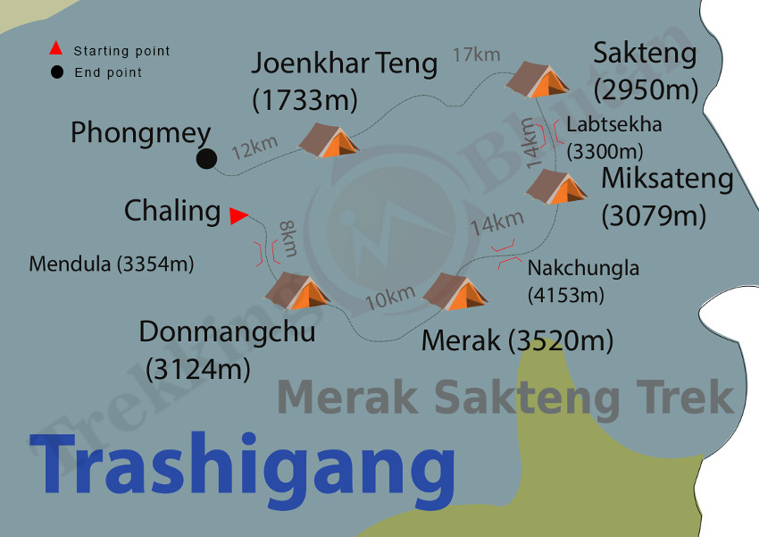 Today, you will drive to Chaling passing through Radhi village. Your trekking crew and pack animals will be waiting here for you. Trek starts with gradual climb towards Shaktimi meadow. You will see yaks and sheep grazing with yak herder’s huts dotted on the hills side. Climb further to reach Mendula Pass at 3354m. From this pass, you will descend through rhododendron forests till Donmang Chu at 3124m. Overnight in camp.